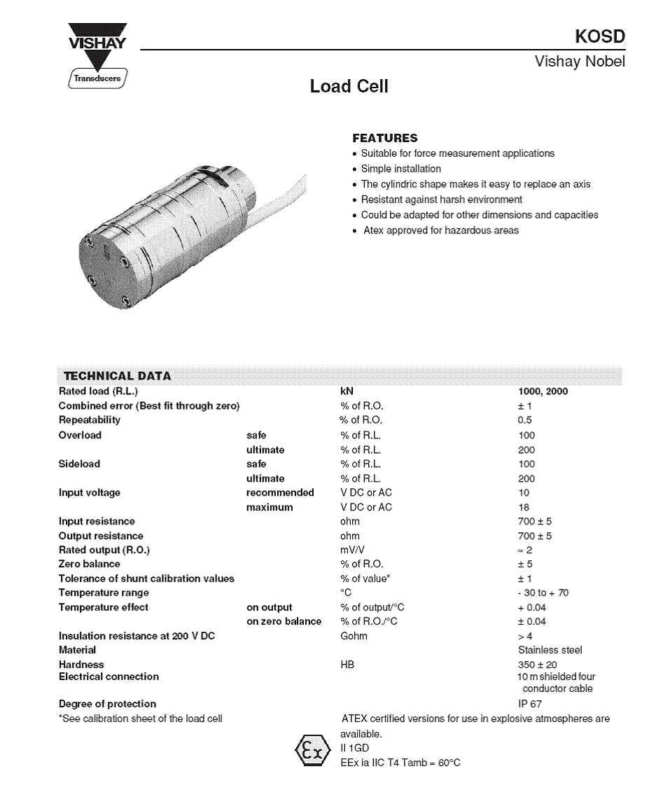 KOSD - 40稱重傳感器具有堅固的外殼,適合在惡劣環(huán)境中測力過載保護應(yīng)用。敏感元件包括三個部分,兩外部分構(gòu)成支持,中間部分是負載傳感的一部分。