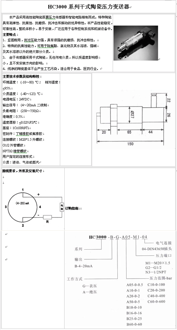 | 產(chǎn)品名稱:HC3000系列 干式陶瓷壓力變送器(pressure sensor) |